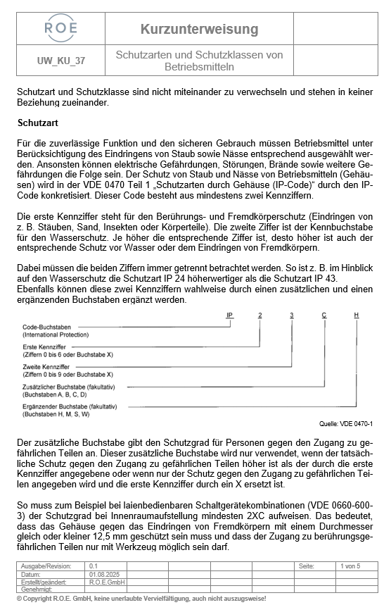 Dieses Dokument beschreibt die Unterschiede zwischen Schutzarten und Schutzklassen von elektrischen Betriebsmitteln. Schutzarten (IP-Code nach VDE 0470-1) kennzeichnen den Schutz vor Fremdkörpern und Wasser, während Schutzklassen (nach VDE 0140-1) die Maßnahmen gegen elektrischen Schlag in die Klassen I, II und III einteilen. Ergänzend werden Beispiele für Geräte sowie Hinweise zur Nutzung in Schulungen für Elektrofachkräfte gegeben.